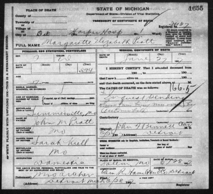 Several years ago I posted about a family mystery that existed on the Pyatt side of my family. Click here to see my original post. The mystery concerned what happened to my Grand Aunt, Maggie Elizabeth Pyatt, who passed away at the age of 17. Over the years, I have done numerous searches on various sites in my quest to find her. No luck. Nothing. I knew, from my father’s recollection, she either moved to Chicago or Detroit. For some reason I decided to check out records available in Detroit first…good thing I did! I discovered that Michigan has all their death certificates digitalized and copies made available online. In searching their database I found Maggie’s death certificate, although her name was spelled a little differently. Her death certificate listed her as Margarette Elizabeth Piatt. After years of researching my Pyatt side of the family, I have become aware of the numerous variations in spelling of the name! What further convinced me that this was my Grand Aunt was that her parents are listed on the certificate and they matched up to my Great-grandparents. John M. Pyatt (Piatt) and Sarah Keele (Keell) both from Missouri. Below is a copy of her death certificate: