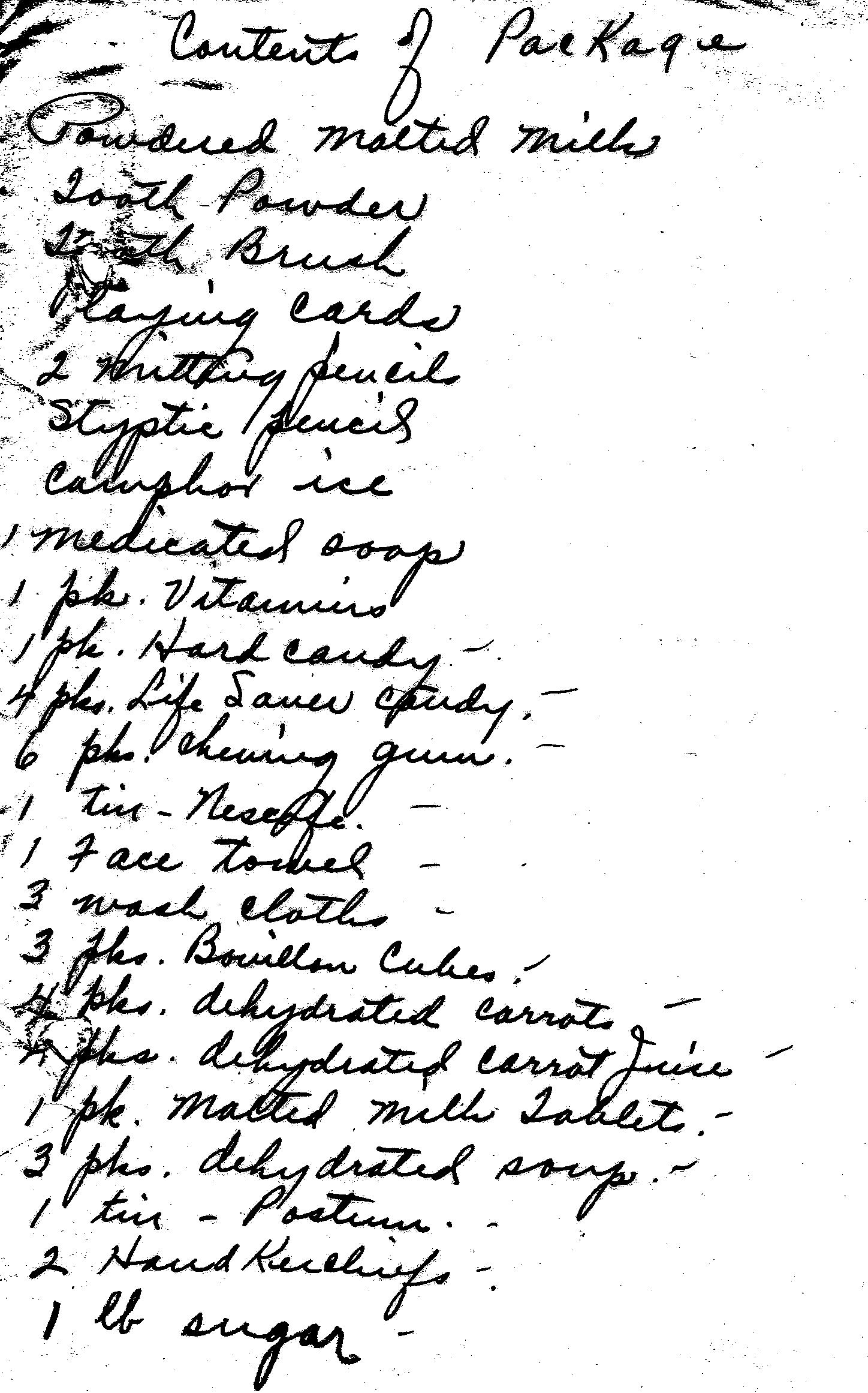 “Arose early. Finished filling box, wrapped and mailed it first thing this a.m. They are making a special bundle of the P.O.W. packages and rushing them thru. Here’s hoping and praying he will get it.“